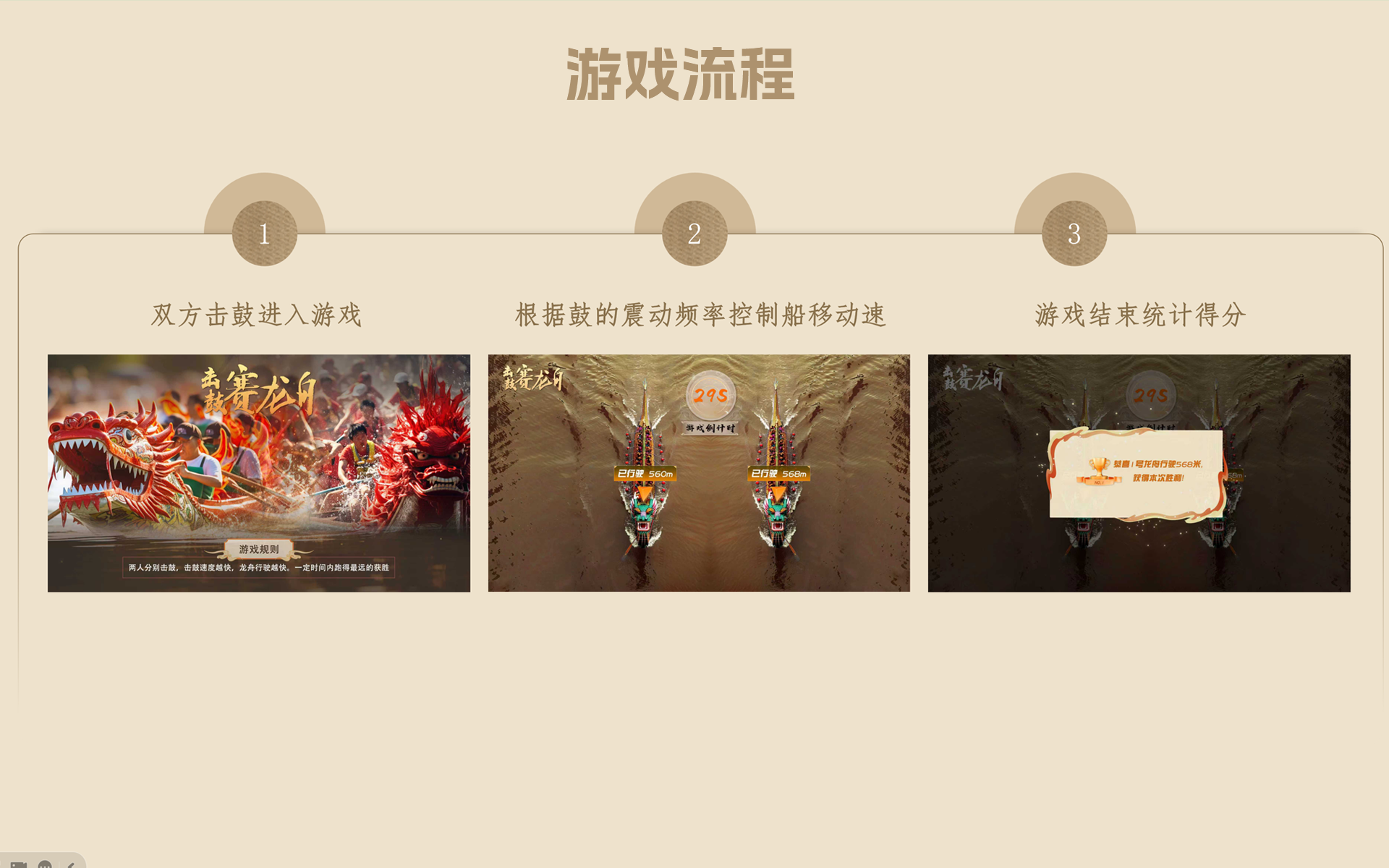 击鼓龙舟赛以 “双人对抗、鼓点控速” 为核心,打造沉浸式互动体验。比赛中,两玩家各执一鼓,鼓手随节奏挥槌敲击,鼓面的震动频率通过传感器实时转化为虚拟龙舟的前进动力 —— 鼓点越密集,震动频率越高,龙舟在屏幕上的行驶速度就越快。