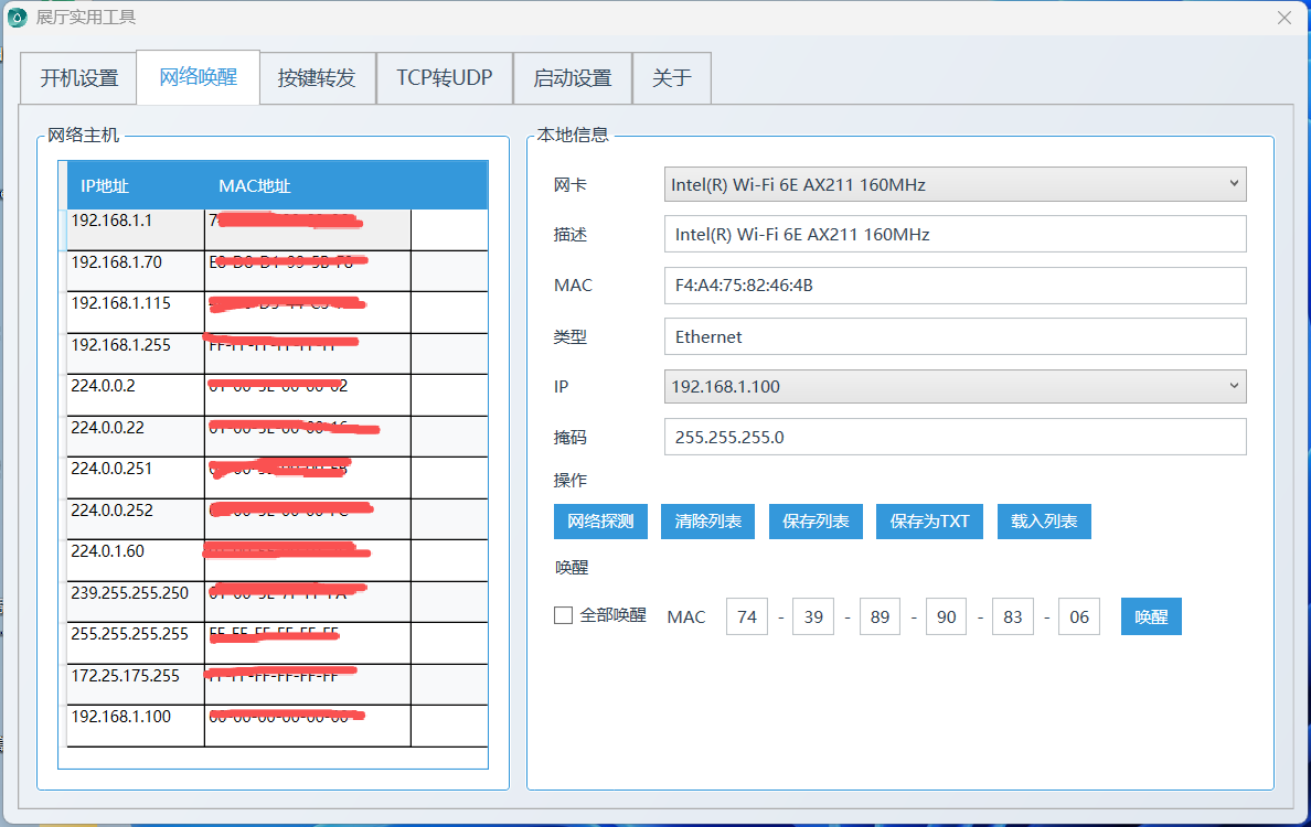 本工具为我司专为展厅调试场景打造,支持MAC地址获取,具备一键唤醒全场电脑、自启动开机设置、中控指令控制开关机、音量、按键信号转udp、TCP 转 UDP 协议转换等实用功能,操作简便、高效易用。欢迎提出优化建议与功能想法,我们将持续迭代更新,以下为详细功能介绍: