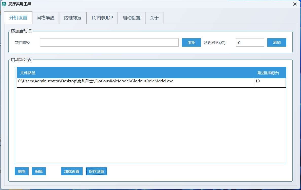 开机设置:可设置程序开机自启动,支持延迟启动。操作时选择需启动的程序,输入延迟时间(秒),添加到启动列表并保存设置,勾选“开机自启动”即可启用;启动项路径不存在时会弹窗提示,不影响其他启动项,延迟时间设为0表示立即启动;支持exe格式和bat格式的文件启动。