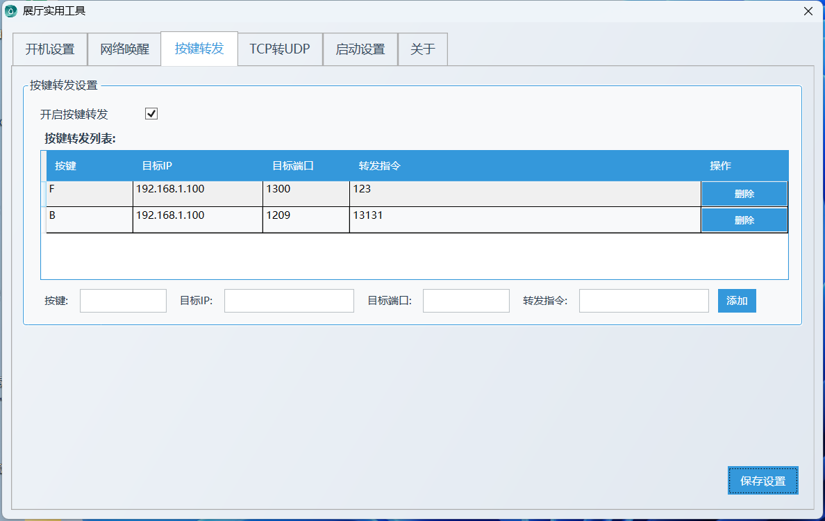 按键转发:可捕获键盘按键,通过UDP转发到指定IP和端口。点击输入框捕获按键,填写目标IP、端口及转发指令,添加到转发列表,勾选“启用按键转发”并保存即可;支持全局按键捕获,可添加多个转发规则。