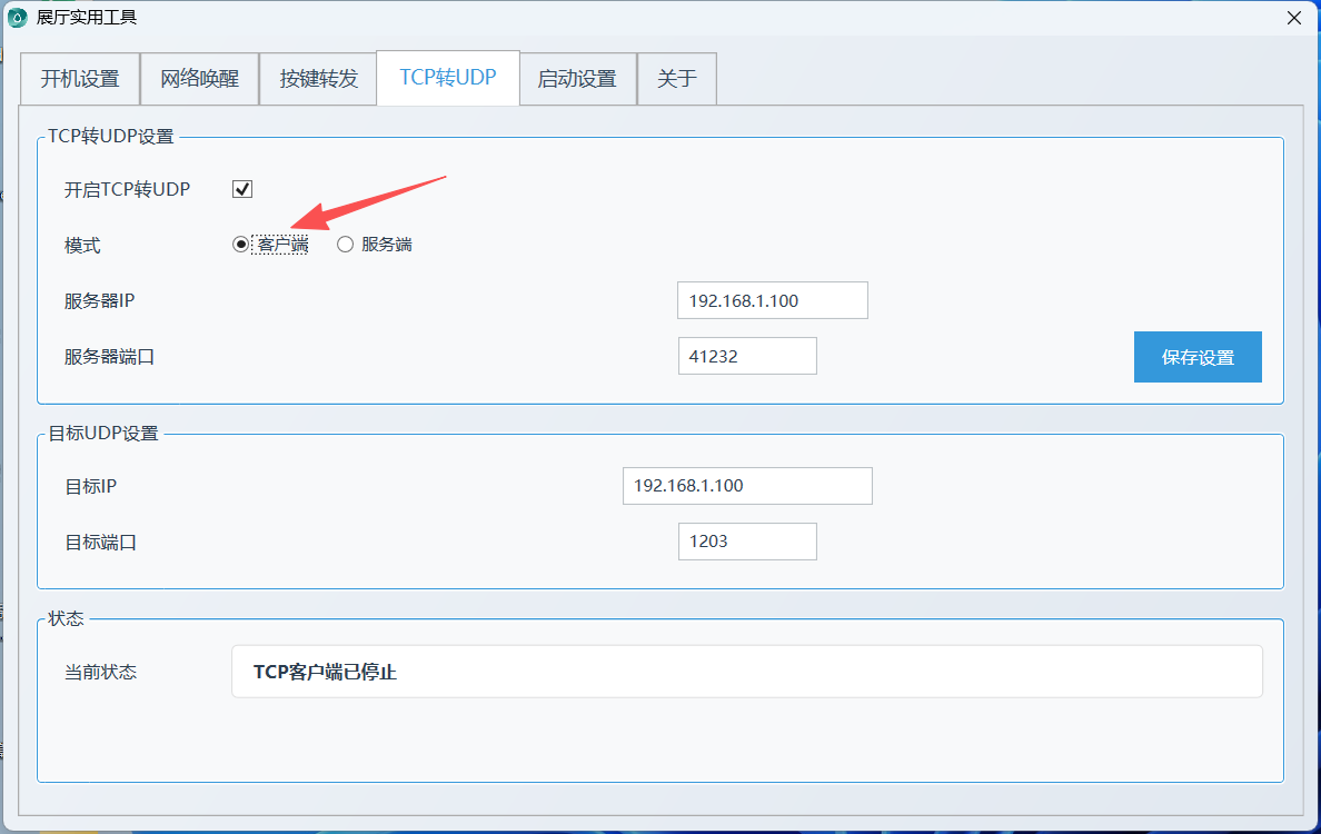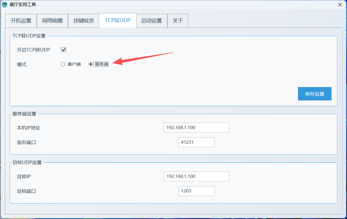 TCP转UDP:可将接收的TCP指令通过UDP转发到指定IP和端口,支持客户端和服务端双模式。选择模式后,客户端输入服务器IP和端口,服务端输入监听端口(将显示本地IP),填写UDP目标IP和端口,启用功能并保存即可;TCP端口被占用时会弹窗提示。