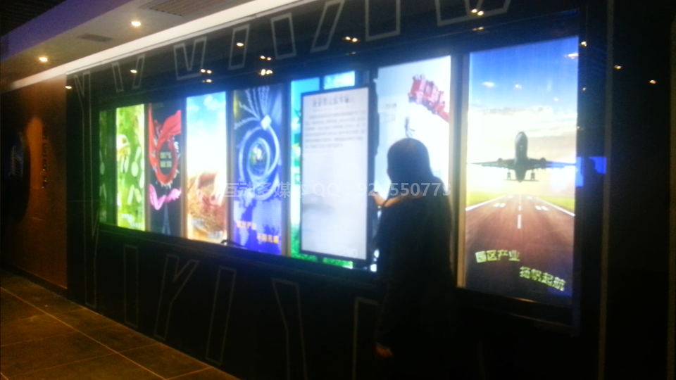 当滑轨按照滑动轨迹滑到某个实物展品或某个时间点面前时,观众可以看到屏幕上这个展品放大的电子影像或展品的相关视频等。另外,还可设置屏幕为触摸屏,以便观众触控选择此展品更详细的图文及视频资料进一步了解。